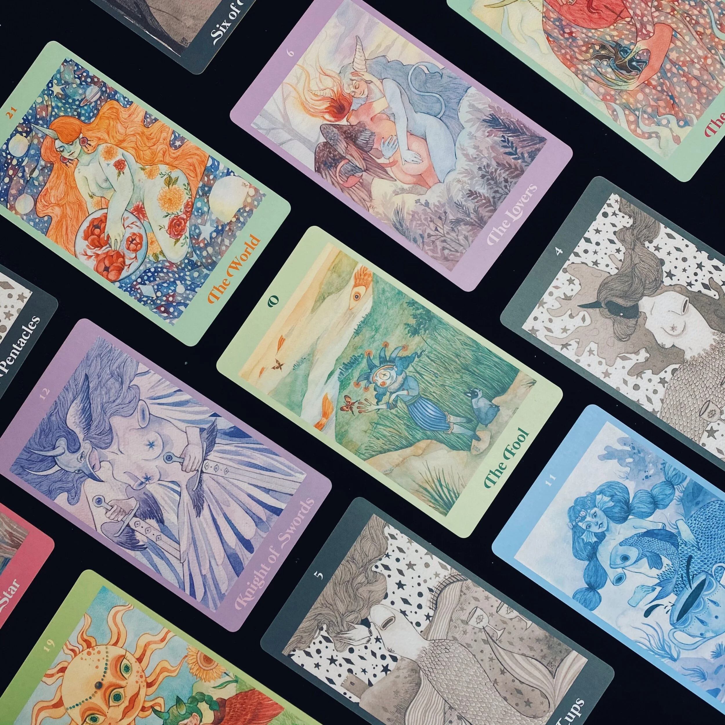 The cards, based on the RWS deck, are delicately illustrated with watercolor on paper over the course of two years and are the illustrative manifestations of how I view the world.